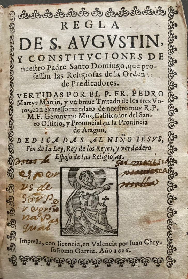 AHMSD, Libro de Óbitos, f. 5r. Regla de san Agustín y constituciones de nuestro Padre Santo Domingo, Valencia, Juan Chrysostomo, 1626 (R/356, 9-3). |