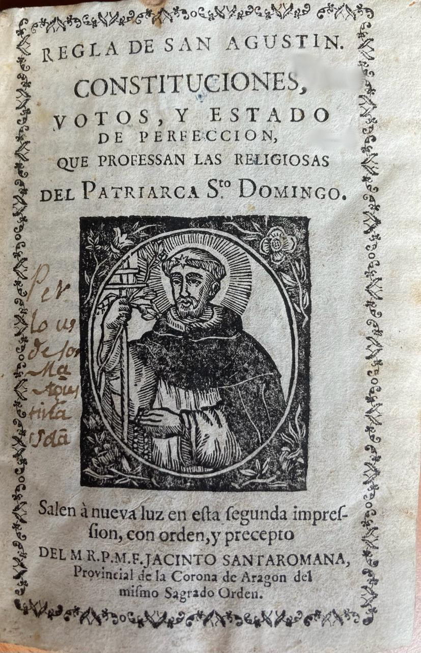 AHMSD, Libro de Óbitos, f. 14r. Regla de san Agustín y Constituciones que profesan las religiosas del patriarca santo Domingo, Valencia, Benito Monfort, 1791 (R/776, 9-8-7). |
